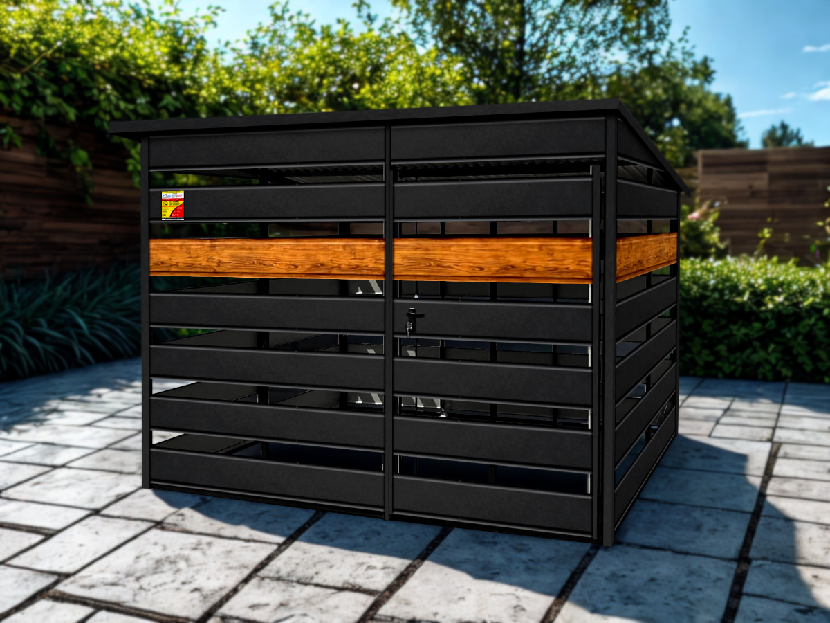 WIATA ŚMIETNIKOWA SMK 2X2 – DRZWI JEDNOSKRZYDŁOWE, OKUCIA BLACHARSKIE, CZARNY MAT & ZŁOTY DĄBTwoja posesja potrzebuje odświeżenia? Chcesz, aby przestrzeń wokół śmietników była nie tylko funkcjonalna, ale też estetyczna i stylowa? Mamy dla Ciebie idealne rozwiązanie – nasza nowoczesna wiata śmietnikowa wykonana w Systemie SMK!