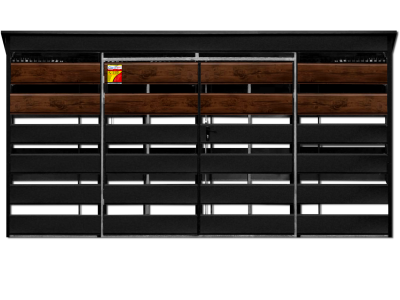 - panele SMK w kolorze CZARNY MAT + 2 pasy paneli w kolorze drewnopodobnym ORZECH