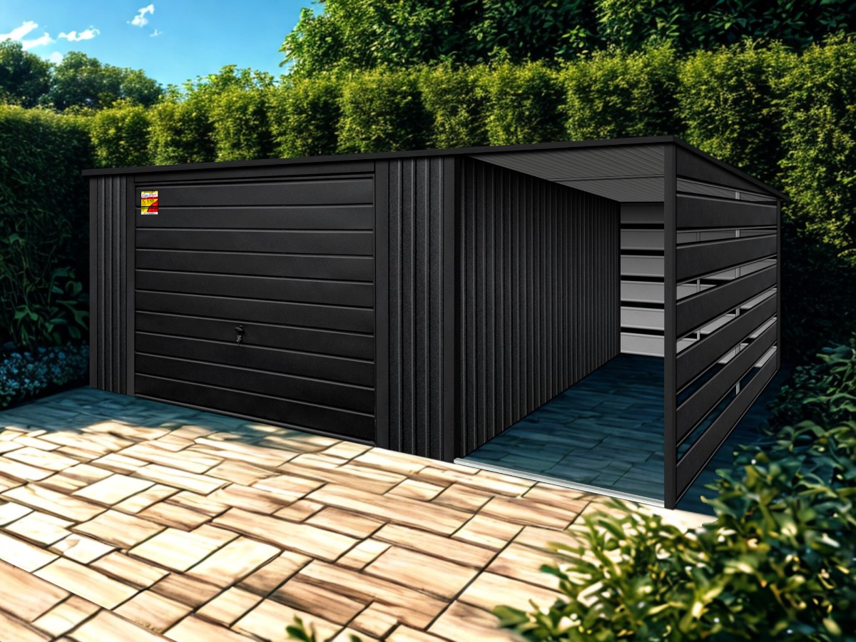 Oferowanym produktem jest innowacyjny garaż blaszany z serii LUX, wzbogacony w dobudowaną wiatę, wykonaną w nowoczesnym Systemie SMK!