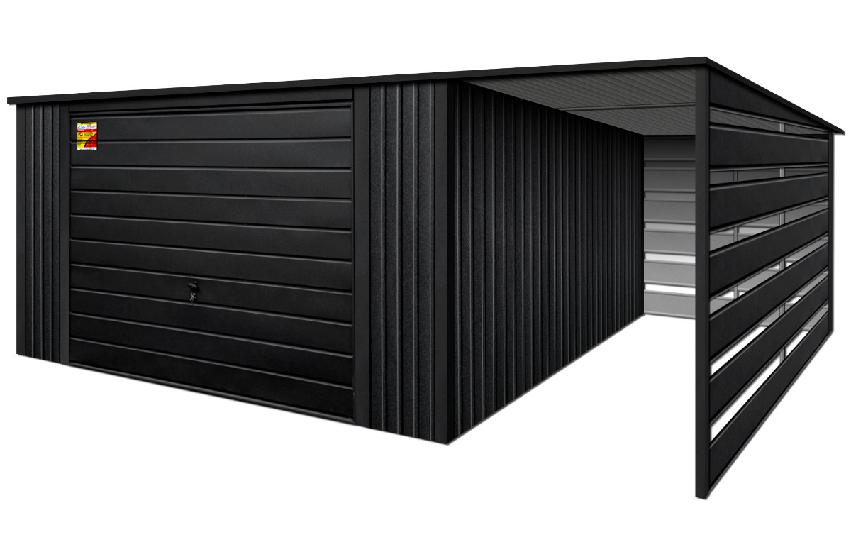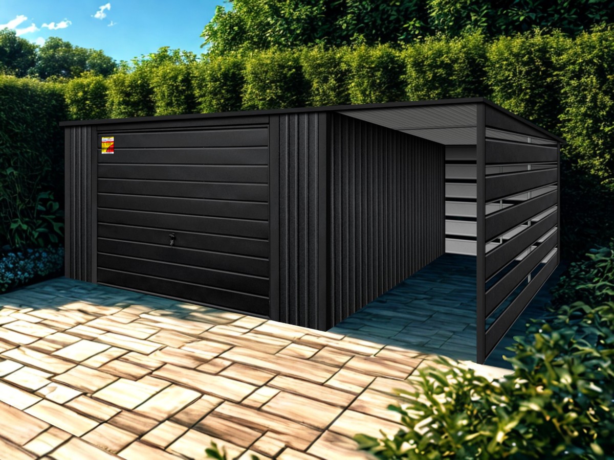 Oferowanym produktem jest innowacyjny garaż blaszany z serii LUX, wzbogacony w dobudowaną wiatę, wykonaną w nowoczesnym Systemie SMK!