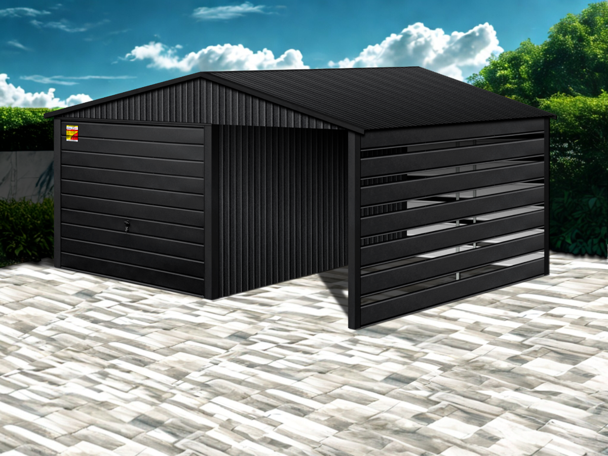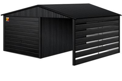 Oferowanym produktem jest innowacyjny garaż blaszany z serii LUX, wzbogacony w dobudowaną wiatę, wykonaną w nowoczesnym Systemie SMK!