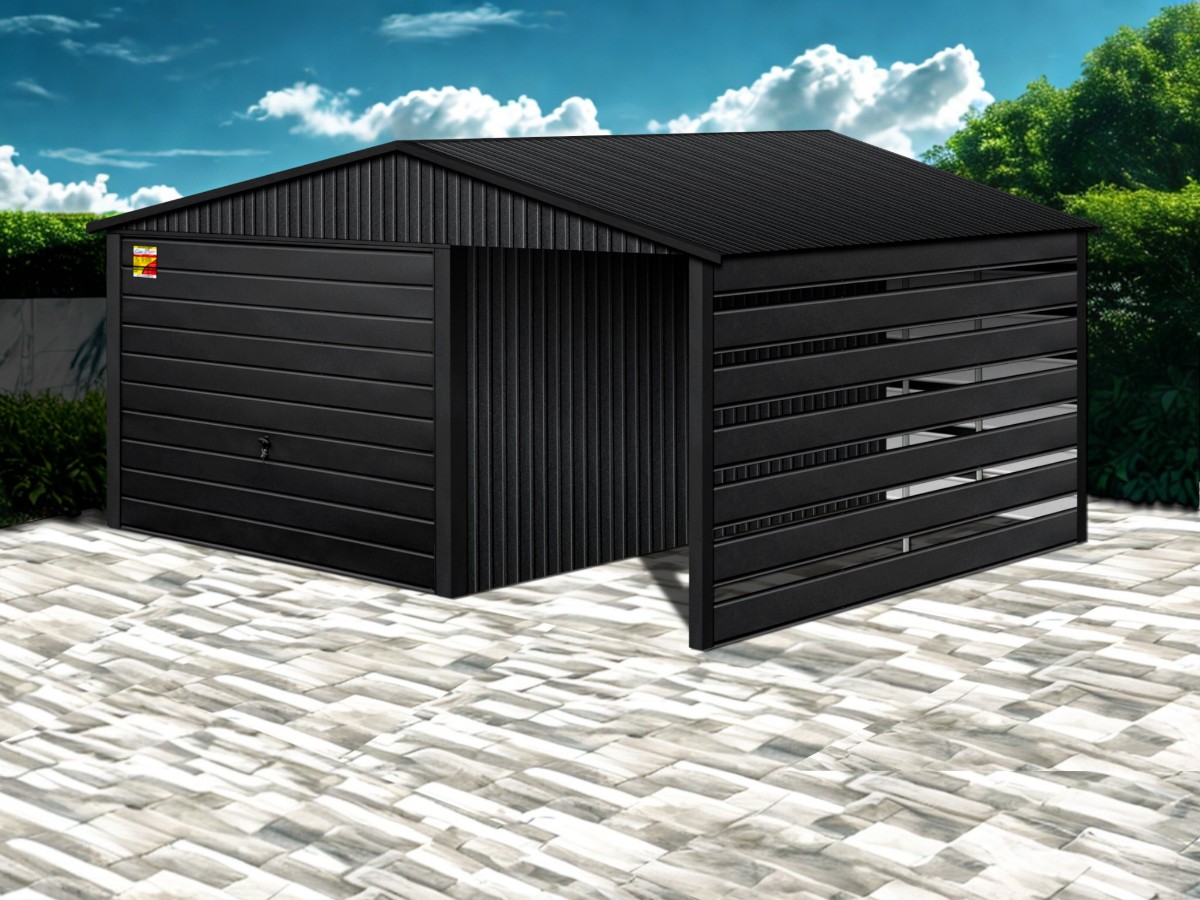 Oferowanym produktem jest innowacyjny garaż blaszany z serii LUX, wzbogacony w dobudowaną wiatę, wykonaną w nowoczesnym Systemie SMK!