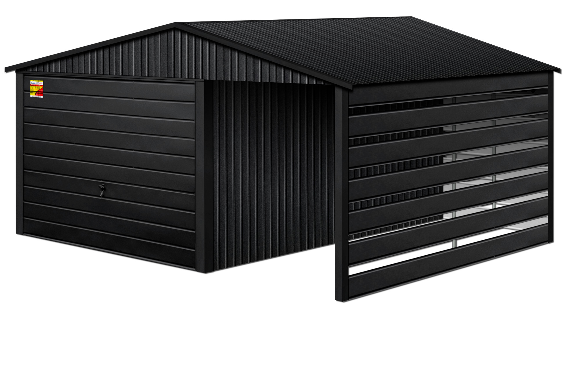 Oferowanym produktem jest innowacyjny garaż blaszany z serii LUX, wzbogacony w dobudowaną wiatę, wykonaną w nowoczesnym Systemie SMK!