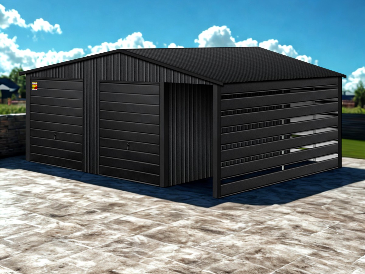 Oferowanym produktem jest innowacyjny garaż blaszany z serii LUX, wzbogacony w dobudowaną wiatę, wykonaną w nowoczesnym Systemie SMK!