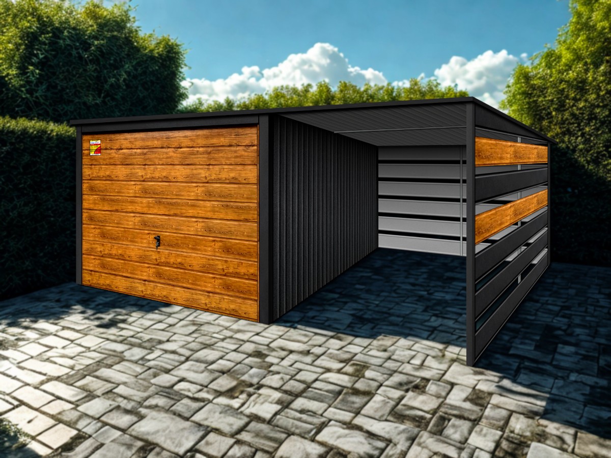 Oferowanym produktem jest innowacyjny garaż blaszany z serii LUX, wzbogacony w dobudowaną wiatę, wykonaną w nowoczesnym Systemie SMK!