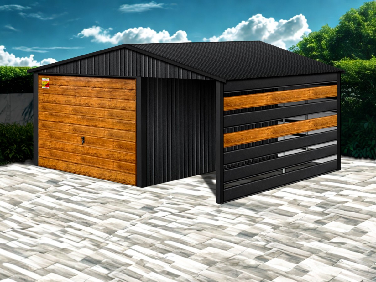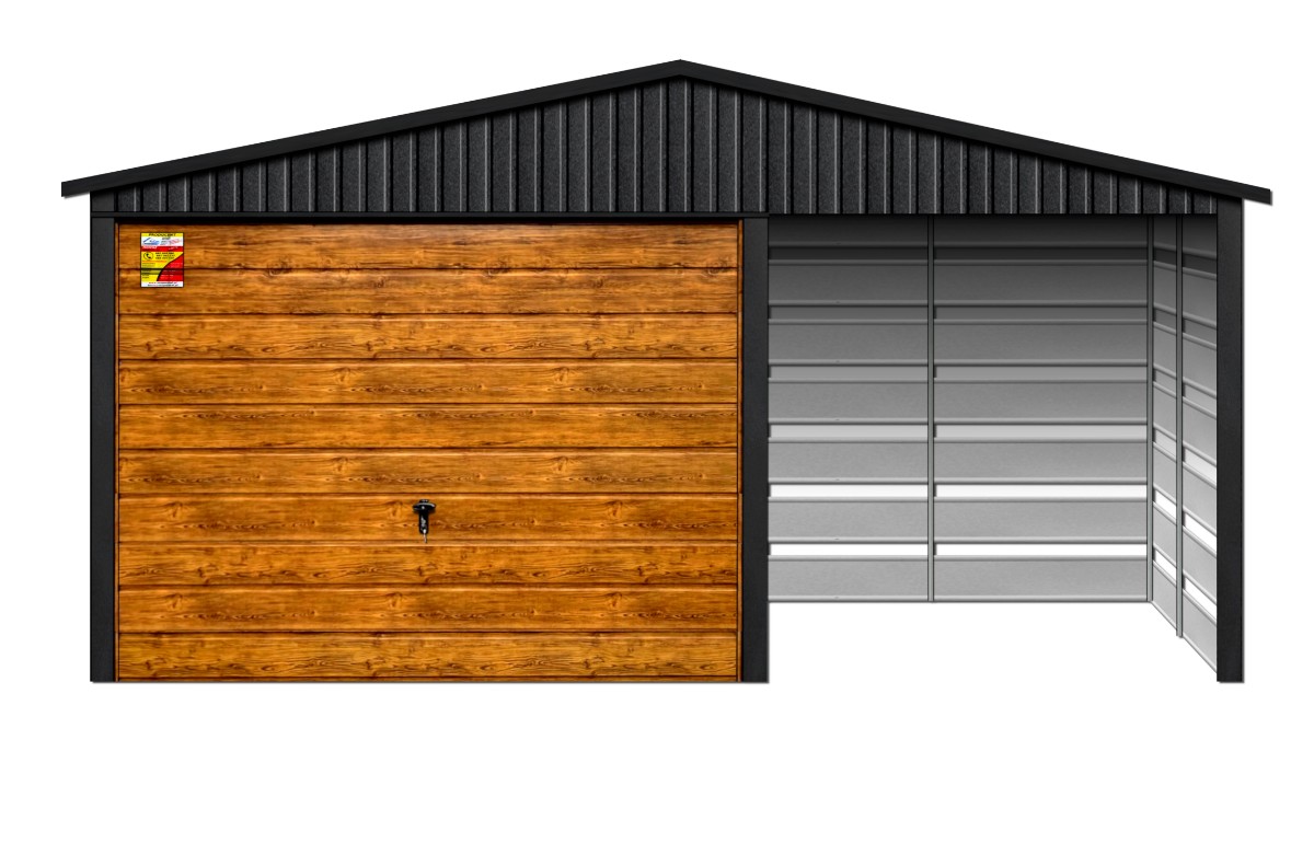 Oferowanym produktem jest innowacyjny garaż blaszany z serii LUX, wzbogacony w dobudowaną wiatę, wykonaną w nowoczesnym Systemie SMK!