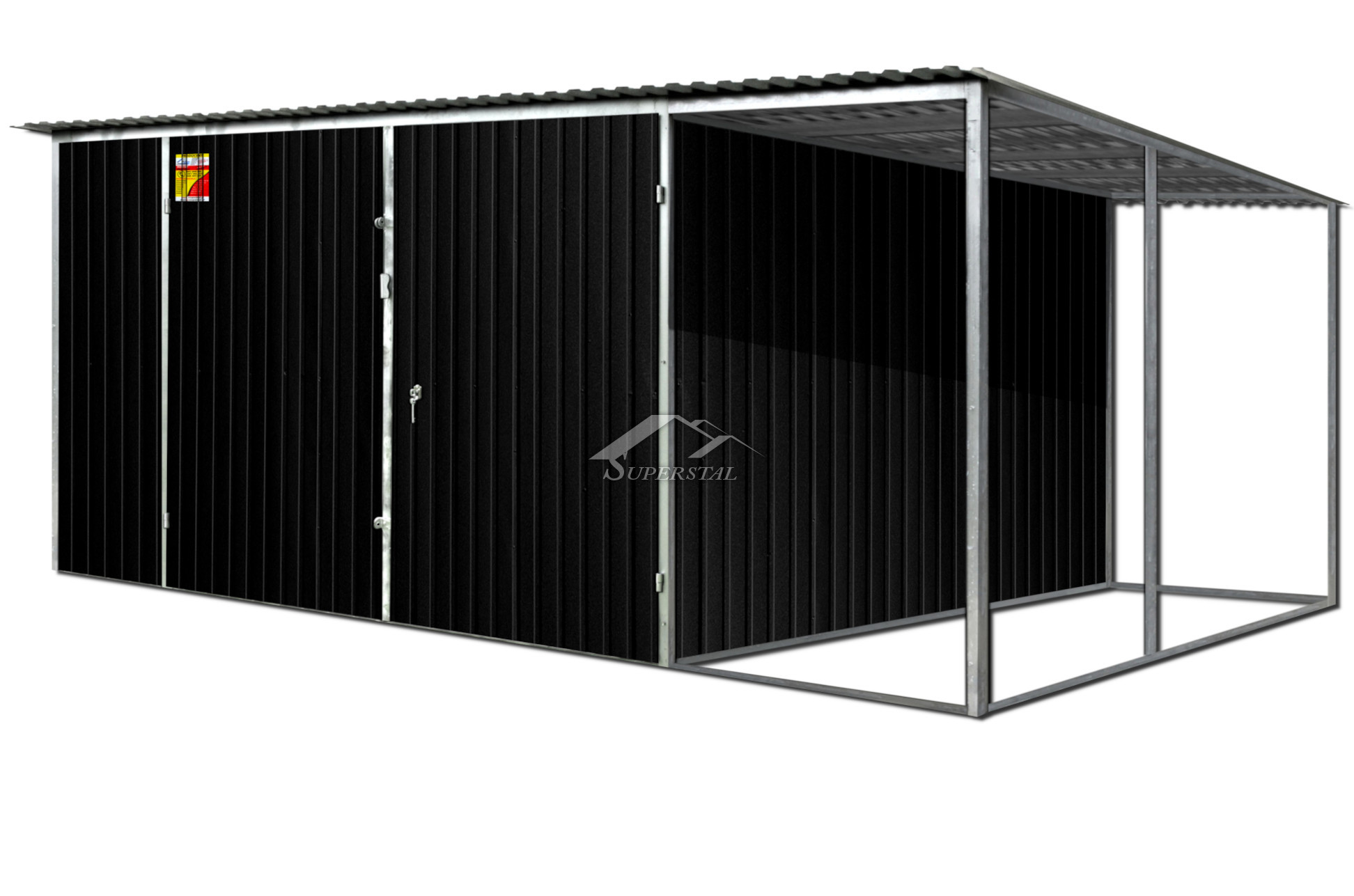 CZARNY GARAŻ BLASZANY AKRYLOWY 6X6 Z WIATĄ – SPAD DACHU DO TYŁU, BRAMA DWUSKRZYDŁOWA Garaż blaszany w wersji akrylowej to świetna propozycja dla osób, które cenią sobie budżetowe rozwiązania, zachowując przy tym powiew innowacyjnych rozwiązań!